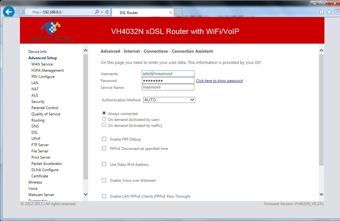 Paso 7. Rellena los campos del menú "Advanced - Internet - Connections - Connection Assistant" con los siguientes valores: