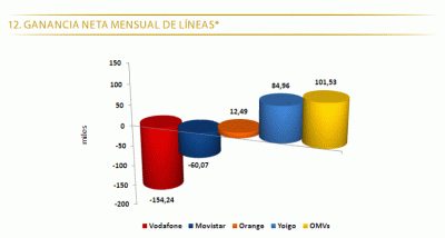 Los operadores virtuales con 101.530 líneas (netas) lideraron el mercado en marzo, frente a Vodafone y Telefónica, que perdieron 154.240 y 60.070 líneas en el mes, respectivamente. Según informa Europa Press, en el caso de Vodafone su portavoz explicó que la pérdida neta de clientes se debe a una "desconexión" de clientes realizada en el mes de marzo.